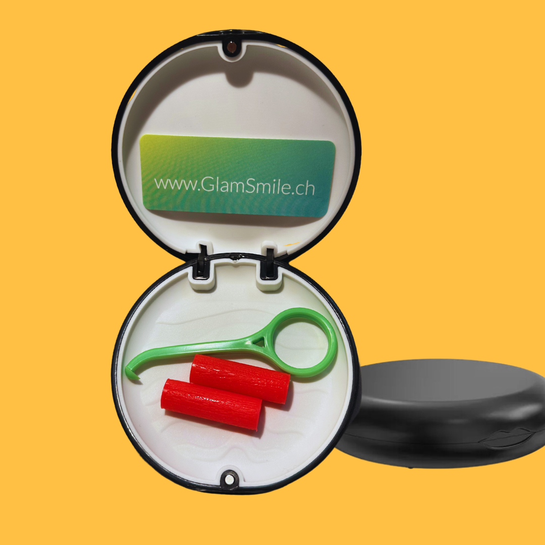 Article phare et exclusivité GlamSmile Boutique! Nos GlamKits contiennent l'essentiel des accessoires dont tu auras besoin durant la durée de ton traitement avec tes gouttières dentaires: 1 étui de rangement, 1 outil de retrait de gouttières dentaires et 2 bâtonnets de mastication.